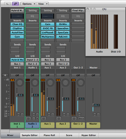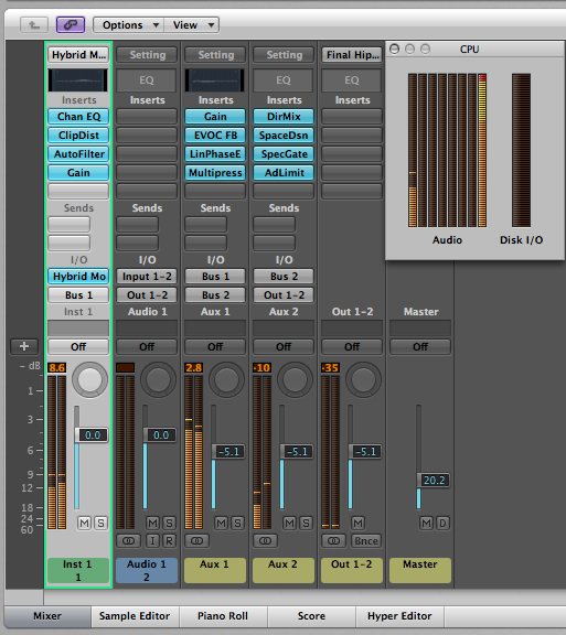 After adjusting the volumes to the respective channel strips appropriately, the result sounds identical, but now the load is distributed among four cores instead of two. You can use this concept to redistribute plug-ins from Audio channel strips, Software Instruments, Auxes, and Outputs (as in this example).