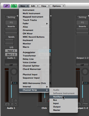 - From the Environment window menu, choose New > Channel Strip > Auxiliary. A channel strip will appear in the environment.