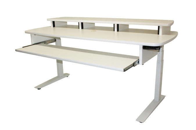 The Summit desk has electronic legs that raise and lower the desk with the push of a button, giving the musician the option to work standing up or sitting all the way to the ground. It has a programmable memory handset and adjustment speed of 1.5" per second with soft start/stop.